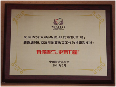 ![]() 2011年5月中國(guó)扶貧基金會(huì)感謝昆百大集團(tuán)5.12汶川地震救災(zāi)工作的捐贈(zèng)和支持!有你參與,更有力量! |