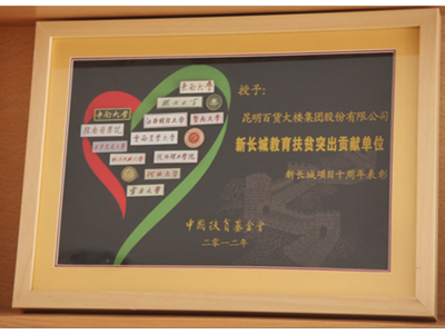 ![]() 2012年中國(guó)扶貧基金會(huì)授予昆百大集團(tuán)新長(zhǎng)城教育扶貧突出貢獻(xiàn)單位獎(jiǎng)項(xiàng) |
