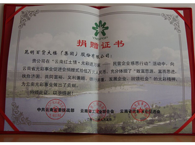 ![]() 2012年“云南紅土情 光彩進(jìn)萬(wàn)家——民營(yíng)企業(yè)感恩行動(dòng)”活動(dòng)捐款25萬(wàn)元的捐贈(zèng)證書 |