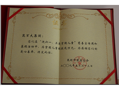 ![]() 2009年昆明市慈善總會(huì)頒發(fā)“迎六一關(guān)愛(ài)貧困兒童”捐款貳萬(wàn)元證書 |