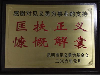 ![]() 2006年昆明市見義勇為基金會(huì)頒發(fā)“匡扶正義 慷慨解囊”獎(jiǎng)牌 |